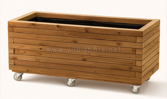 Dekoratif Ahşap Saksı Verde , Frenli tekerlek yapısı ile beraber istediğiniz alana haraket ettirilebilir bir yapıya sahiptir.Bu özellik sayesinde saksının bulunduğu alanın temizlenmesi oldukça kolaylaşacaktır.