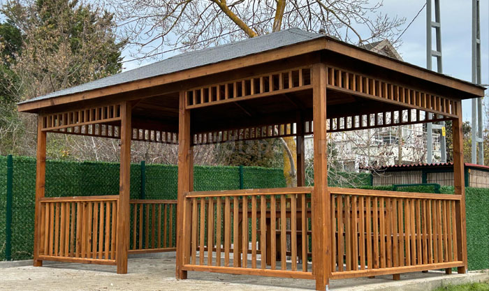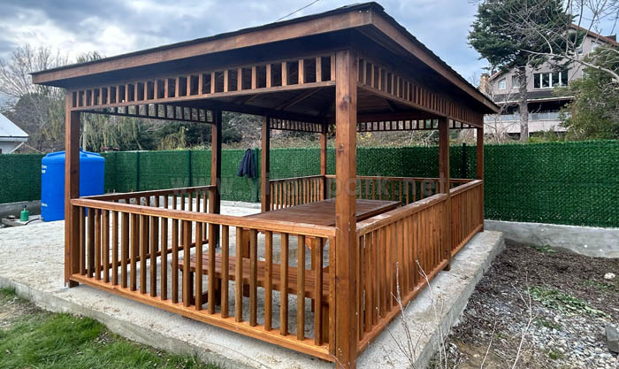 Gri Çatılı Ahşap Çardak isimli ürünümüzde Teak reni Ahşap su bazlı vernik uygulanmış olup , Gri Renkte Çatı Shingle izolasyonu tercih edilmiştir.3x5=15 m2 ölçülerinde 25 cm Çatı çıkmaları (saçakları) bulunmaktadır.